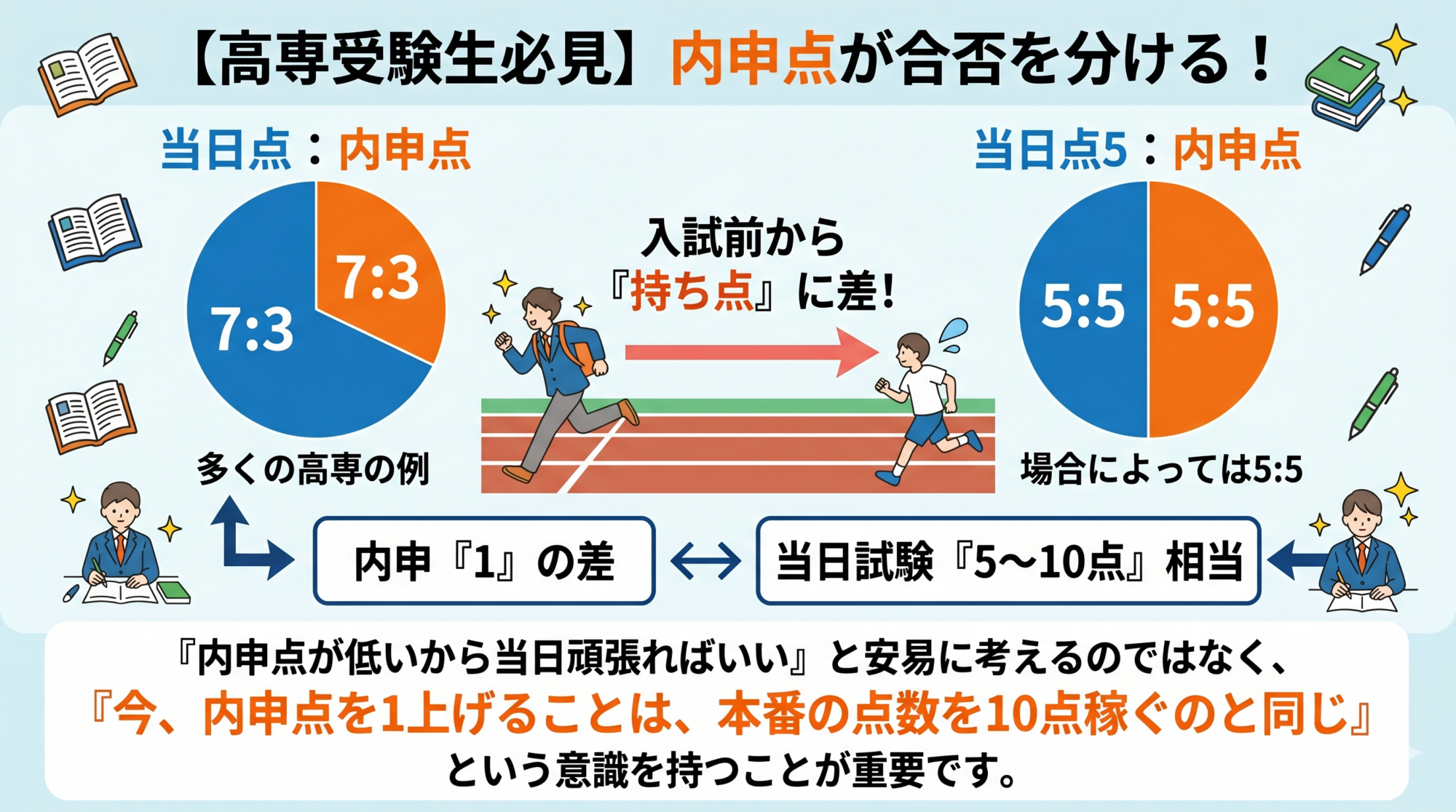 多くの高専では「当日点:内申点 = 7:3」や、場合によっては「5:5」という比率で合否が決まります。