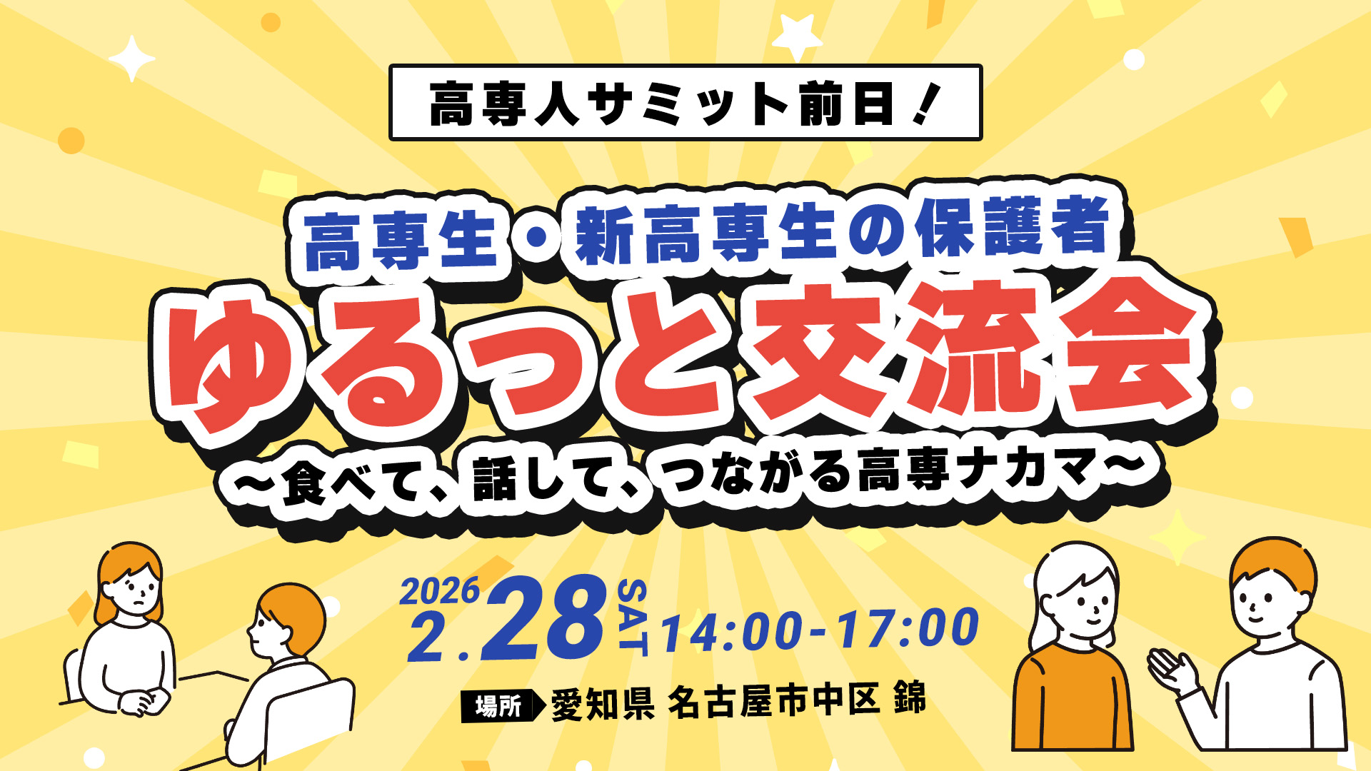 今すぐ申し込む! ゆるっと交流会の概要を見る! 高専人サミット前日に 保護者同士でゆるっと交流しませんか?✨ 高専人サミット前日に 保護者同士でゆるっと交流しませんか?✨ 今年から保護者様も参加可能になった「高専人サミット」。 その前日に、保護者同士でお菓子を食べながら ゆるっと交流できるイベントを開催します! 普段なかなか集まる機会のない今だからこそ。 次の日の高専人サミットを“もっと楽しめる” 高専仲間を、ぜひここで作りましょう✨ 〜この交流会の3つのコンセプト〜 01. ゆるっと話せる、保護者の居場所 01. ゆるっと話せる、保護者の居場所 この交流会は、説明会でも相談会でもなく、自由交流をベースとしています。おやつを食べながら、思ったことを少し話したり、誰かの話を静かに聞いたり。「話してもいいし、話さなくてもいい」そんな気軽で、あたたかい保護者の居場所を目指しています。 02. 不安を抱えたまま、気軽に来ていい 高専に入学する前、あるいは通い始めてからも、 保護者の不安はなかなか言葉にしづらいものです。 「うちの子、ちゃんとやっていけるかな」 「親はどこまで関わればいいんだろう」 この交流会では、 同じ立場の保護者や、少し先を歩く先輩保護者の話を 「聞くだけ」でも大丈夫です。 抱えてきた不安を、 少し軽くするきっかけになればと思っています。 02. 不安を抱えたまま、気軽に来ていい 02. 不安を抱えたまま、気軽に来ていい 高専に入学する前、あるいは通い始めてからも、 保護者の不安はなかなか言葉にしづらいものです。 「うちの子、ちゃんとやっていけるかな」 「親はどこまで関わればいいんだろう」 この交流会では、 同じ立場の保護者や、少し先を歩く先輩保護者の話を 「聞くだけ」でも大丈夫です。 抱えてきた不安を、 少し軽くするきっかけになればと思っています。 03. つながって迎える、高専人サミット前日 03. つながって迎える、高専人サミット前日 高専人サミットの前日に、 保護者同士がゆるくつながる時間をつくりました。 前日に少し話した人がいるだけで、 翌日のサミットが、少し安心できるものになります。 「知っている顔がある」 それだけで、イベントの楽しみ方は変わります。 この交流会は、 高専人サミットをより安心して迎えるための、前日のひと息です。 〜どんな参加のしかたでもOKです!〜 30分だけ立ち寄る おやつを食べながら雑談※ お子さまと一緒に参加 ご都合に合わせて、自由にご参加・ご退室いただける交流会となっております。 ※お菓子の持ち込みはご遠慮ください。お菓子は運営側でご用意いたします。 〜もちろん新高専生・高専生のご参加も大歓迎!〜 この交流会は保護者の方が中心ですが、 高専生ご本人の参加も歓迎! 当日は、高専生同士が気軽に交流できるよう、 数学を使ったミニゲームなどもご用意しています。 「ちょっと立ち寄る」「同じ高専生と話してみる」 そんな参加のしかたでも大丈夫! 〜前回のオフラインイベントも大好評!〜 初めての方も安心してご参加いただけるイベントです。 ぜひお気軽にご参加くださいませ。 〜開催場所〜 住所:〒4600003 愛知県 名古屋市中区 錦 2-13-25 貸切ダイニング リリーバンケット栄 伏見 店 2階~6階※詳しい階については、確定次第こちらのページに追記いたします。 〜ゆるっと交流会概要〜 日時 2026年2月28日(土) 14:00-17:00 当日の受付時間 2026年2月28日(土) 14:00-16:00※ご都合の良い時間に来場可能 申込締切 2026年2月27日(金) 23:59まで 参加費用 お子様(受験生・高専生):無料保護者様:1,000円※参加費用は当日、会場にてお支払いいただきます。※お支払い方法は現金のみになります。 タイムスケジュール 14:00 開場受付時間:14:00〜16:00ご都合の良い時間にご来場いただけます14:30〜14:40 開催のご挨拶イベントの趣旨説明交流時の簡単なルール共有(飲食について など)14:40〜17:00 自由交流タイム保護者同士・高専生同士のフリートーク途中参加・途中退席は自由です17:00〜17:10 閉場終了のご案内スタッフの会場整理のため、順次ご退席をお願いいたします 開催場所 住所:〒4600003 愛知県 名古屋市中区 錦 2-13-25貸切ダイニング リリーバンケット栄 伏見 店 2階~6階※詳しい階については、確定次第こちらのページに追記いたします。 注意事項 お菓子の持ち込みはご遠慮ください。お菓子は運営側でご用意いたします。 参加方法 まずはお申し込み情報をフォームにご記入ください。 お申し込みいただいてから2営業日以内にメールが届きます。 〜参加メリット〜 高専生活の「リアル」をシェアできる! 高専人サミットの前に“知ってる人”ができて安心! 軽食を食べながら楽しく交流できる! 新高専生・高専生の保護者 ゆるっと交流会! \ 1分でお申し込み完了 / 今すぐ申し込む! ゆるっと交流会! のお申し込み \ ゆるっと交流会!/ 今すぐ申し込む!