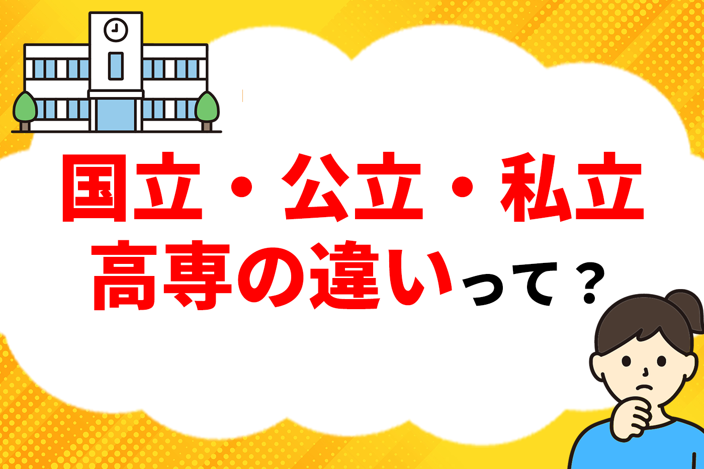 A.高専には国立・公立・私立の3種類があり、主な違いは「設置主体(誰が運営しているか)」「学費」「学校ごとの特色」です。