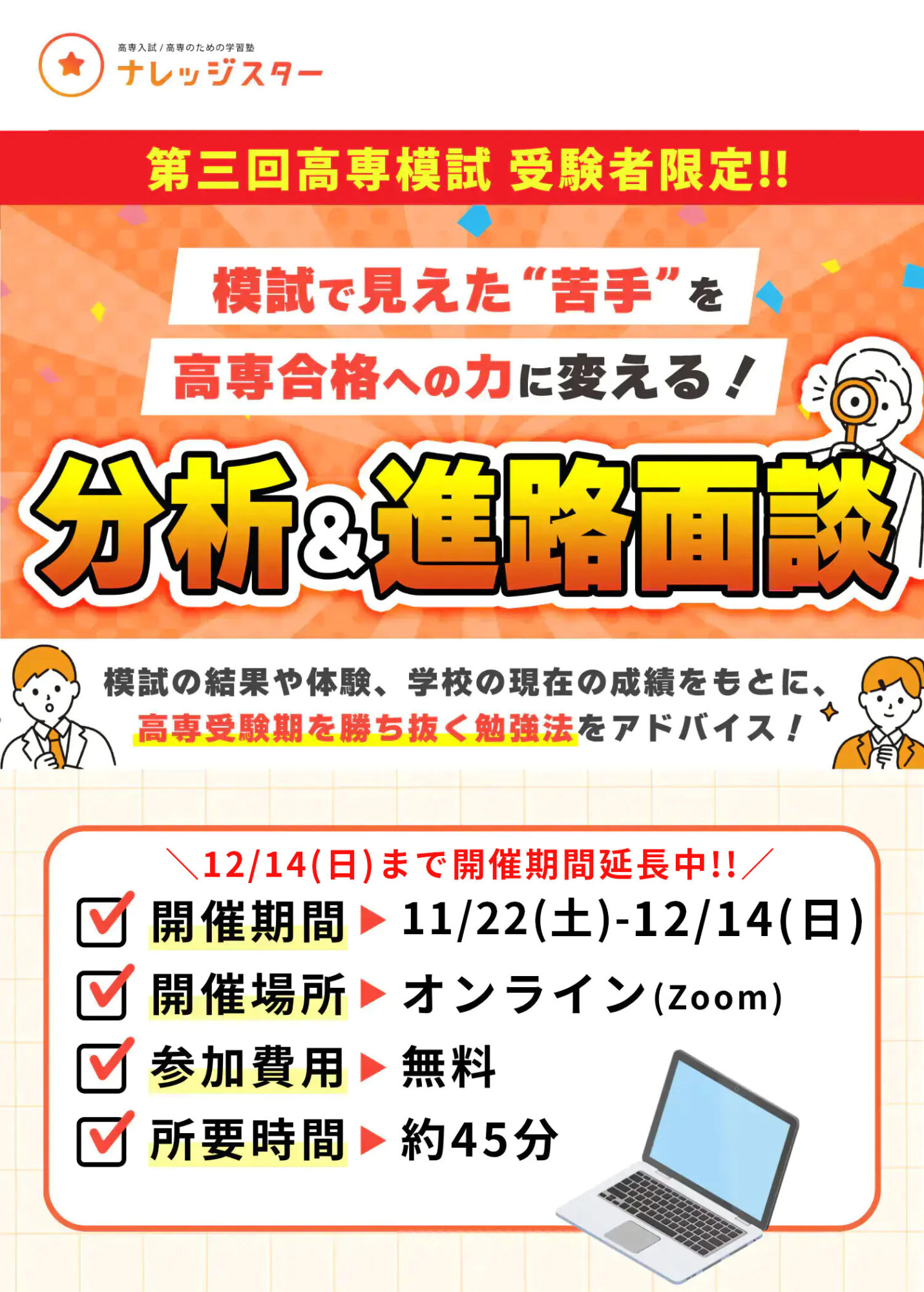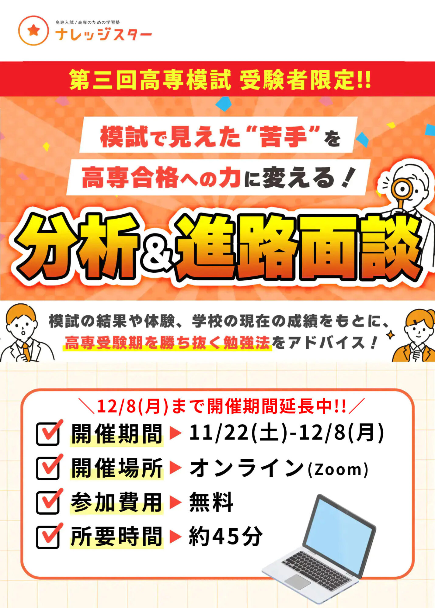 \スマホ・タブレットで参加OK/ 1分で申し込む!! \"苦手"を高専合格の力に変える!/分析&進路面談 1分で申し込む!! \"苦手"を高専合格の力に変える!/分析&進路面談 1分で申し込む!! \"苦手"を高専合格の力に変える!/分析&進路面談 1分で申し込む!! 分析&進路面談のお申し込み \ 全国どこからでも参加可能! / 1分で申し込む!