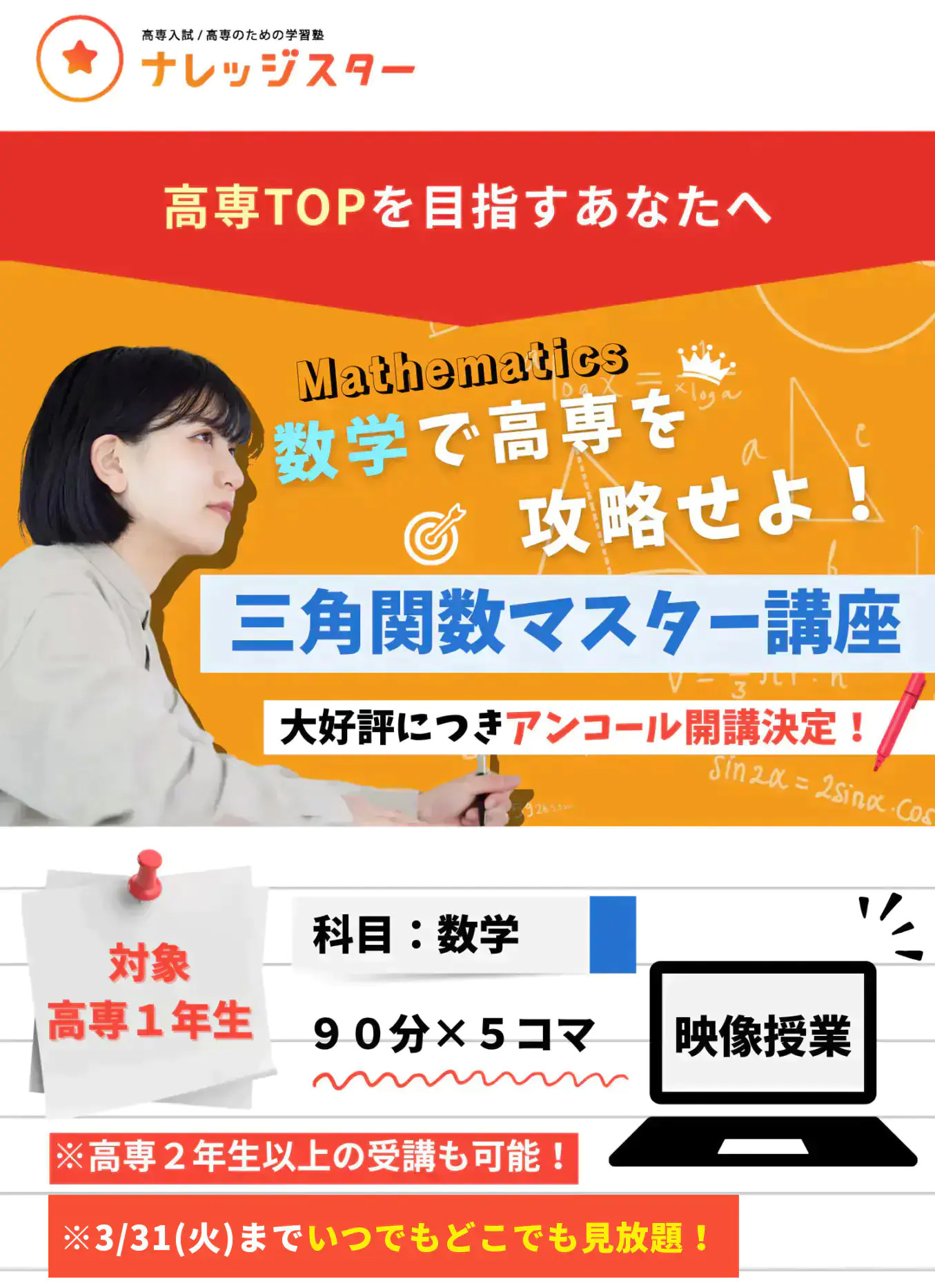 次回申込締切:2026/1/6(火)受講開始:2026/1/8(木)受講可能期間:2026/3/31(火)まで受講料金:20,000円(税込) ※8/23-9/1に開催された三角関数マスター講座のアーカイブ映像になります。※毎週水曜日を入金確認日とし、木曜日に受講案内メールをお送りする予定です。 1分で申し込む! \大好評につきアンコール開講!/三角関数マスター講座 1分で申し込む!! ※8/23-9/1に開催された三角関数マスター講座のアーカイブ映像になります。 ※毎週水曜日を入金確認日とし、 木曜日に受講案内メールをお送りする予定です。 さらに…! 数学の理解を確かなものにし、 高専TOPへグッと近づきたい方へ。 高専生のためのマスター講座 期間限定で開講! お申し込み受付中! \積分を“本質”から徹底理解!/ 積分マスター講座 ✔︎オンライン授業(90分×5日間)✔︎受講費用:25,000円(税込)✔︎締切:12/9(火) 詳細はこちら! アンコール開講一覧 \二次関数・二次方程式を最短攻略!/二次関数・二次方程式マスター講座 ✔︎映像授業(90分×6コマ)✔︎受講費用:20,000円(税込)✔︎締切:1/6(火) 詳細はこちら! \微分を“本質”から徹底理解!/ 微分マスター講座 ✔︎映像授業(90分×5コマ)✔︎受講費用:20,000円(税込)✔︎締切:1/6(火) 詳細はこちら! \積分を“本質”から徹底理解!/ 積分マスター講座 ✔︎映像授業(90分×5コマ)✔︎受講費用:20,000円(税込)✔︎締切:1/6(火) 詳細はこちら! 複数受講をご検討の方へ。パック申し込みもご用意! \高専数学の土台はここで決まる!/ 関数マスターパック ¥40000 ¥ 35,000 (税込) ✔ 二次関数・二次方程式マスター講座(映像授業) ✔ 三角関数マスター講座(映像授業) \微積のつながりで応用力アップ!/ 微分積分マスターパック ¥40000 ¥ 35,000 (税込) ✔ 微分マスター講座(映像授業) ✔ 積分マスター講座(映像授業) \超重要単元をまとめて攻略!/ 高専数学マスターパック ¥80000 ¥ 70,000 (税込) ✔ 二次関数・二次方程式マスター講座(映像授業) ✔ 三角関数マスター講座(映像授業) ✔ 微分マスター講座(映像授業) ✔ 積分マスター講座(映像授業) マスター講座受講までの流れ ①マスター講座お申し込み お申し込みいただいてから1時間以内にお振り込み先情報をお送りします。 ②受講準備 ご入金を確認後、ナレッジスターより、1/8(木)以降、毎週木曜日に受講案内メールをお送りいたします。 ③映像授業開始 受講準備が整ったらいよいよ受講開始です。 単元マスター講座のお申し込み