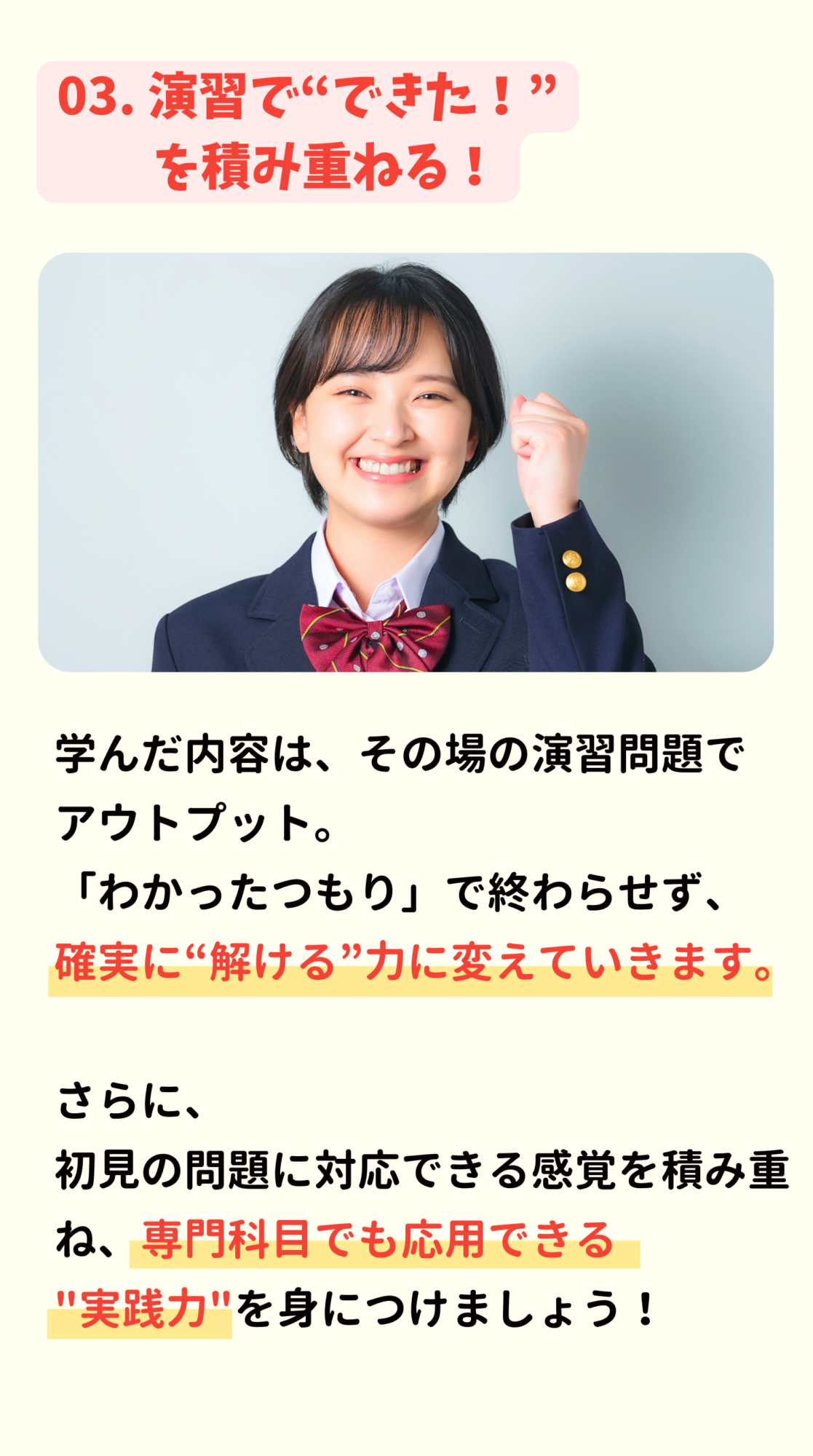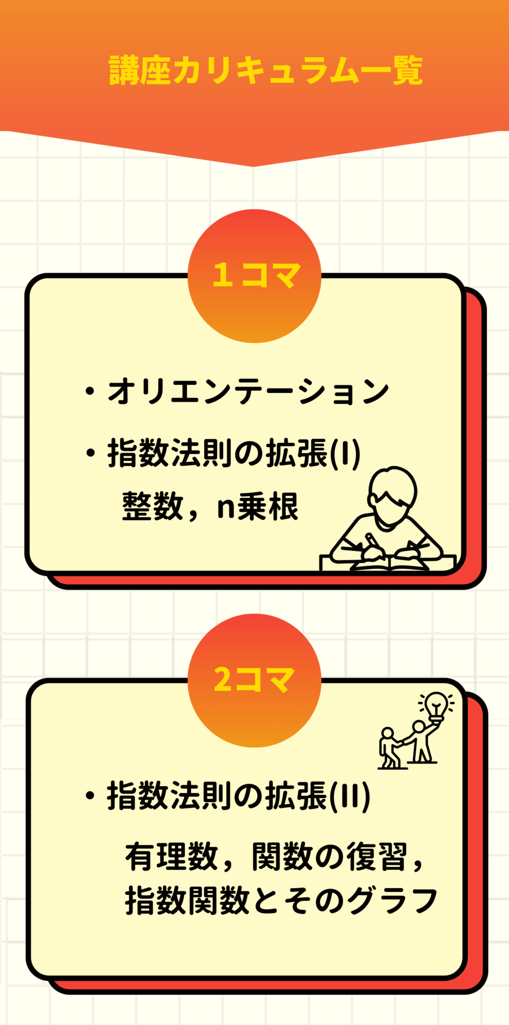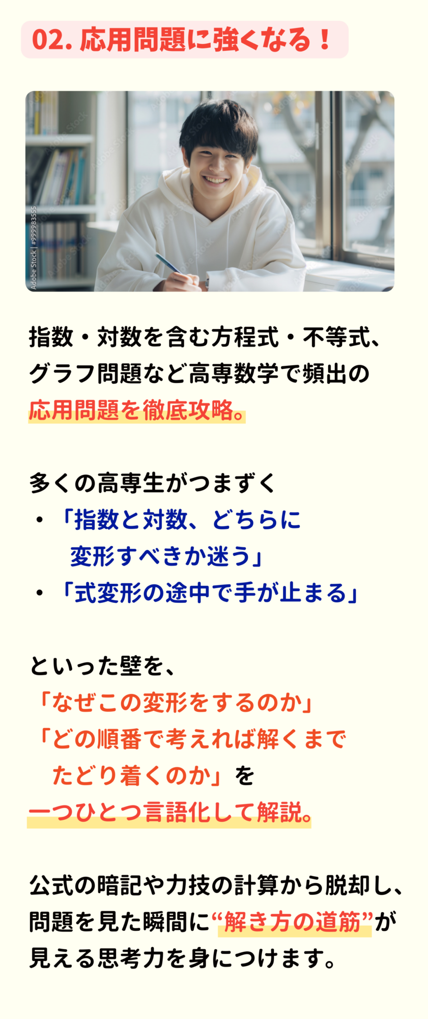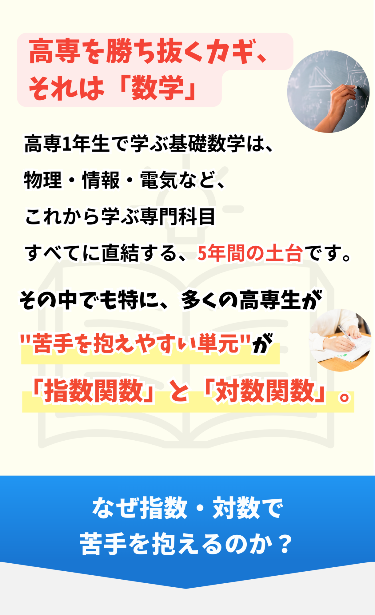 次回申込締切:2026/3/17(火) 受講開始:2026/3/19(木) 受講可能期間:2026/3/31(火)まで 受講料金:20,000円(税込) ※12/15-22に開催された積分マスター講座のアーカイブ映像になります。 ※毎週水曜日を入金確認日とし、木曜日に受講案内メールをお送りする予定です。 \指数対数マスター講座/ 1分で申し込む!! \たった5日で微分をマスター!/微分マスター講座 1分で申し込む!! \大好評につきアンコール開講!/指数対数マスター講座 1分で申し込む!! \大好評につきアンコール開講!/指数対数マスター講座 1分で申し込む!! さらに…! 数学の理解を確かなものにし、 高専TOPへグッと近づきたい方へ。 高専生のためのマスター講座 期間限定でアンコール開講! アンコール開講一覧 \二次関数・二次方程式を最短攻略!/二次関数・二次方程式マスター講座 ✔︎映像授業(90分×6コマ)✔︎受講費用:20,000円(税込) 詳細はこちら! \三角関数の“壁”を一気に突破!/ 三角関数マスター講座 ✔︎映像授業(90分×5コマ)✔︎受講費用:20,000円(税込) 詳細はこちら! \微分を“本質”から徹底理解!/ 微分マスター講座 ✔︎映像授業(90分×5コマ)✔︎受講費用:20,000円(税込) 詳細はこちら! 複数受講をご検討の方へ。パック申し込みもご用意! \高専数学の土台はここで決まる!/ 関数マスターパック ¥40000 ¥ 35,000 (税込) ✔ 二次関数・二次方程式マスター講座(映像授業) ✔ 三角関数マスター講座(映像授業) \微積のつながりで応用力アップ!/ 微分積分マスターパック ¥40000 ¥ 35,000 (税込) ✔ 微分マスター講座(映像授業) ✔ 積分マスター講座(映像授業) \超重要単元をまとめて攻略!/ 高専数学マスターパック ¥80000 ¥ 70,000 (税込) ✔ 二次関数・二次方程式マスター講座(映像授業) ✔ 三角関数マスター講座(映像授業) ✔ 微分マスター講座(映像授業) ✔ 積分マスター講座(映像授業) マスター講座受講までの流れ ①マスター講座お申し込み お申し込みいただいてから1時間以内にお振り込み先情報をお送りします。 ②受講準備 ご入金を確認後、ナレッジスターより、3/5(木)以降、毎週木曜日に受講案内メールをお送りいたします。 ③映像授業開始 受講準備が整ったらいよいよ受講開始です。 単元マスター講座のお申し込み