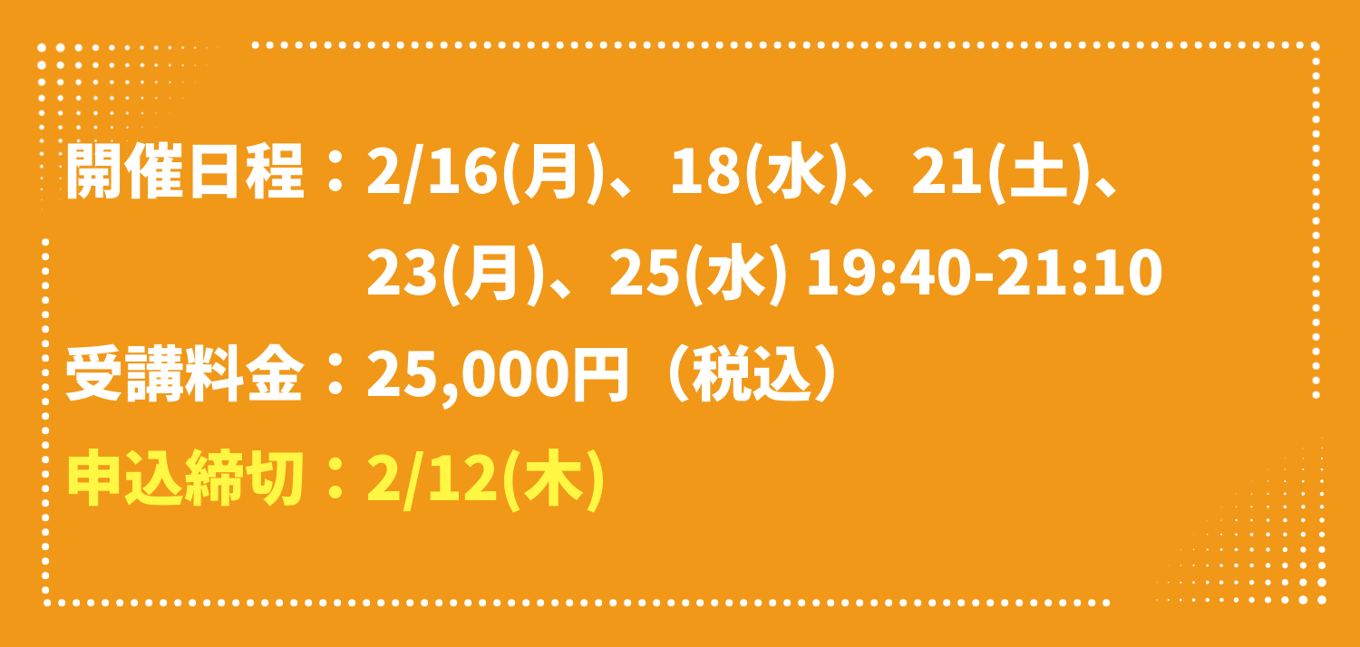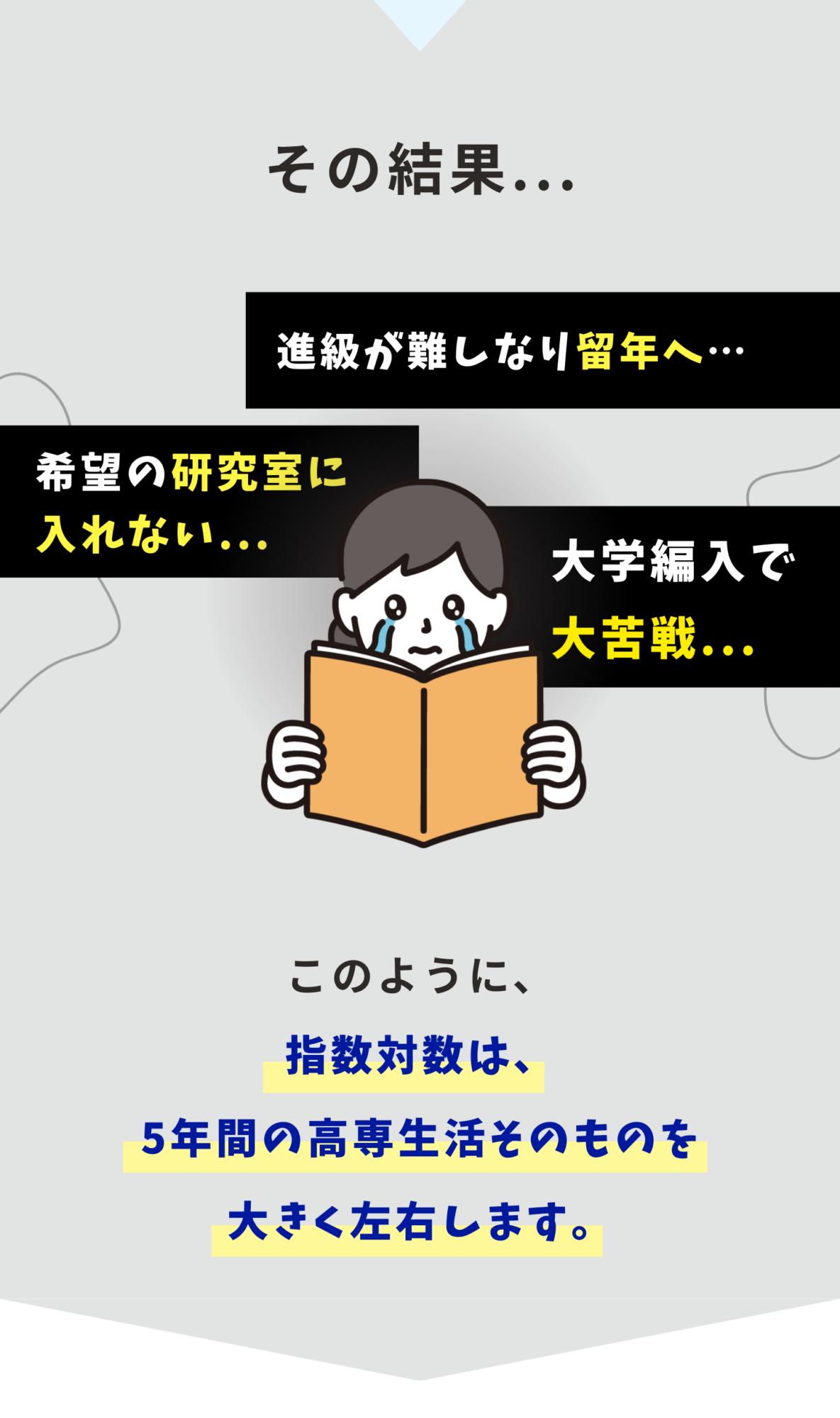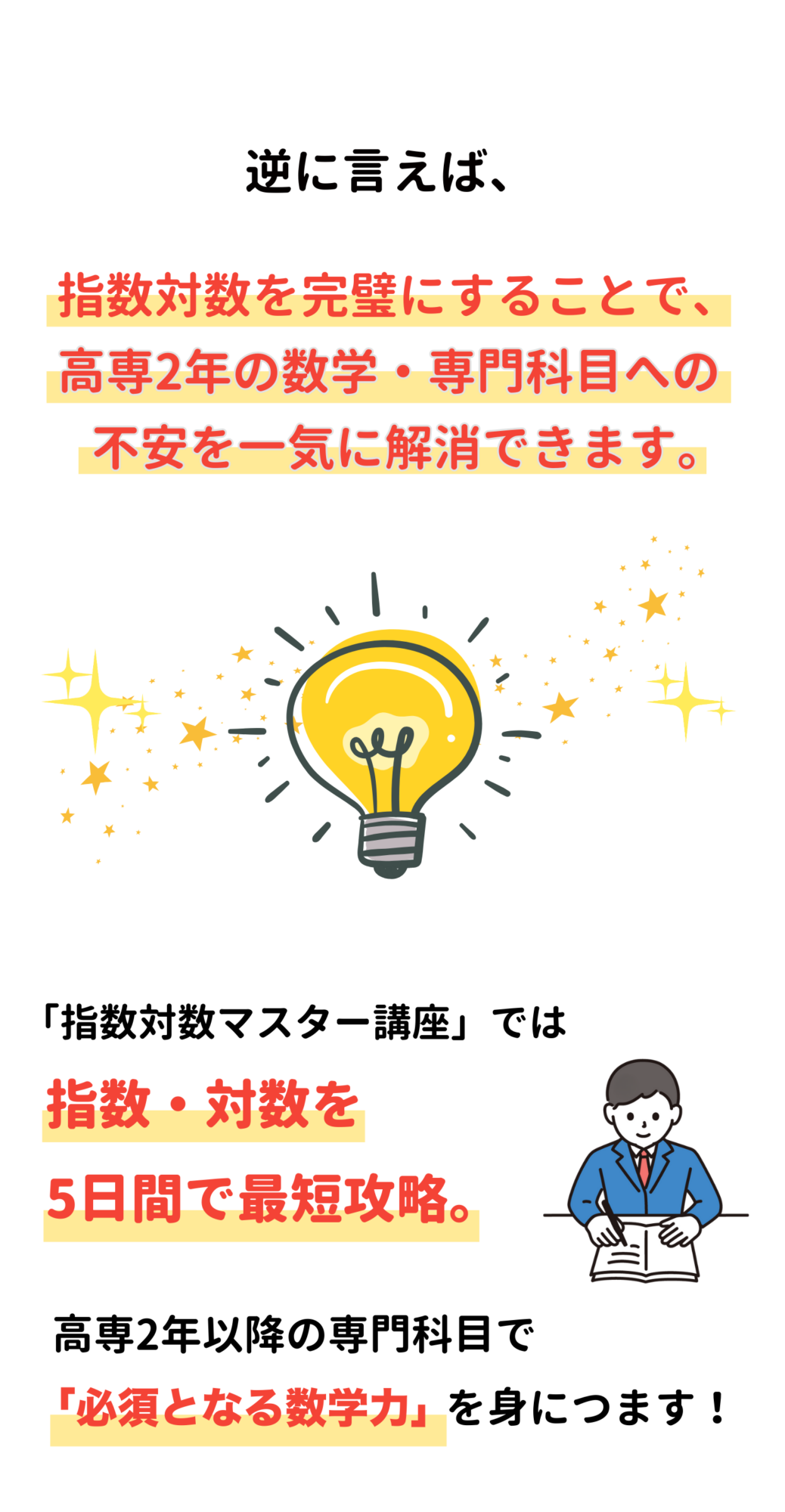 \指数対数マスター講座/ 1分で申し込む!! さらに...2月8日までにご入金いただいた方限定で 高専留年対策講座プレゼント! 高専5年間を「留年せずに」勝ち抜くノウハウがこれでもか!とばかりに詰まった史上初の「高専での勉強法」徹底解説授業!約1時間半に及ぶ詳細な解説で、高専生活を勝ち抜く力を身に着けよう! カリキュラム はじめに 「留年」のしくみ 赤点と救済措置 安全な先生と危険な先生 過去問の入手活用法 留年しがちな学生像 仮進級 / 本講座のまとめ ※2月8日までにご入金の確認が取れた方へ、特典配布メールをお送りいたします。 \たった5日で微分をマスター!/微分マスター講座 1分で申し込む!! \たった5日で指数・対数をマスター!/指数対数マスター講座 1分で申し込む!! \たった5日で指数・対数をマスター!/指数対数マスター講座 1分で申し込む!! \たった5日で指数・対数をマスター!/指数対数マスター講座 1分で申し込む!! さらに…! 数学の理解を確かなものにし、 高専TOPへグッと近づきたい方へ。 高専生のためのマスター講座 期間限定でアンコール開講! アンコール開講一覧 \二次関数・二次方程式を最短攻略!/二次関数・二次方程式マスター講座 ✔︎映像授業(90分×6コマ)✔︎受講費用:20,000円(税込) 詳細はこちら! \三角関数の“壁”を一気に突破!/ 三角関数マスター講座 ✔︎映像授業(90分×5コマ)✔︎受講費用:20,000円(税込) 詳細はこちら! \微分を“本質”から徹底理解!/ 微分マスター講座 ✔︎映像授業(90分×5コマ)✔︎受講費用:20,000円(税込) 詳細はこちら! \積分を“本質”から徹底理解!/ 積分マスター講座 ✔︎映像授業(90分×5コマ)✔︎受講費用:20,000円(税込) 詳細はこちら! 複数受講をご検討の方へ。パック申し込みもご用意! \高専数学の土台はここで決まる!/ 関数マスターパック ¥40000 ¥ 35,000 (税込) ✔ 二次関数・二次方程式マスター講座(映像授業) ✔ 三角関数マスター講座(映像授業) \微積のつながりで応用力アップ!/ 微分積分マスターパック ¥40000 ¥ 35,000 (税込) ✔ 微分マスター講座(映像授業) ✔ 積分マスター講座(映像授業) \超重要単元をまとめて攻略!/ 高専数学マスターパック ¥85000 ¥ 70,000 (税込) ✔ 二次関数・二次方程式マスター講座(映像授業) ✔ 三角関数マスター講座(映像授業) ✔ 微分マスター講座(映像授業) ✔ 積分マスター講座(映像授業) マスター講座受講までの流れ ①マスター講座お申し込み お申し込みいただいてから1時間以内にお振り込み先情報をお送りします。 ②受講準備 ご入金を確認後、ナレッジスターより、2/5(木)以降、毎週木曜日に受講案内メールをお送りいたします。※指数対数マスター講座につきましては、ご入金確認後、2/15(日)18:00より受講案内メールをお送りいたします。 ③映像授業開始 受講準備が整ったらいよいよ受講開始です。 単元マスター講座のお申し込み