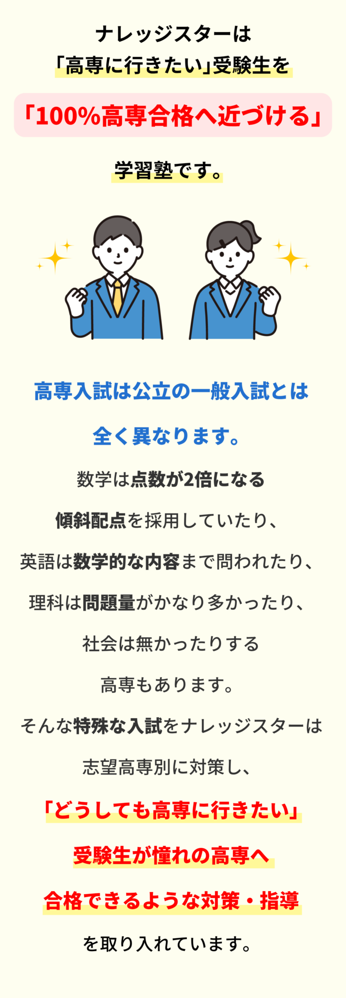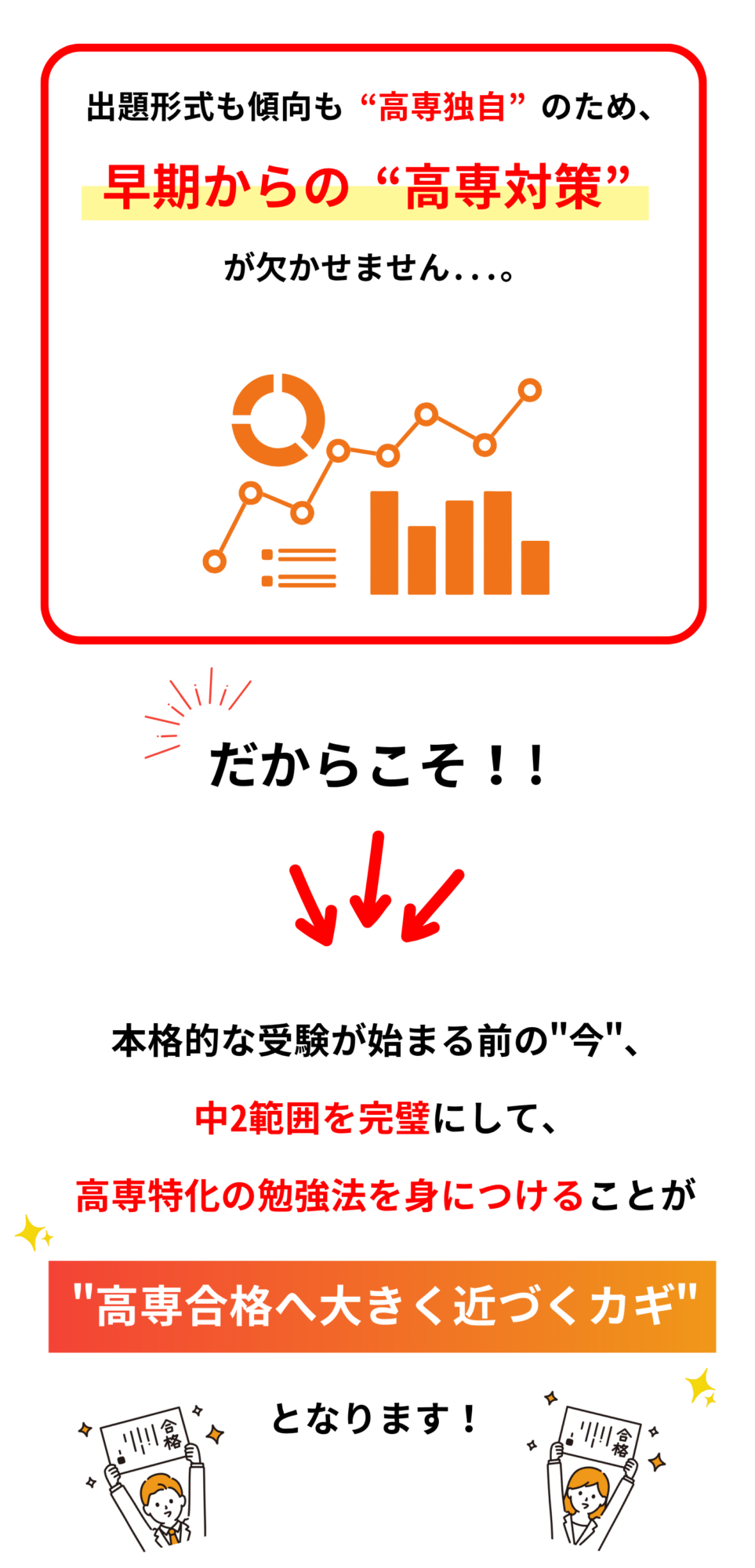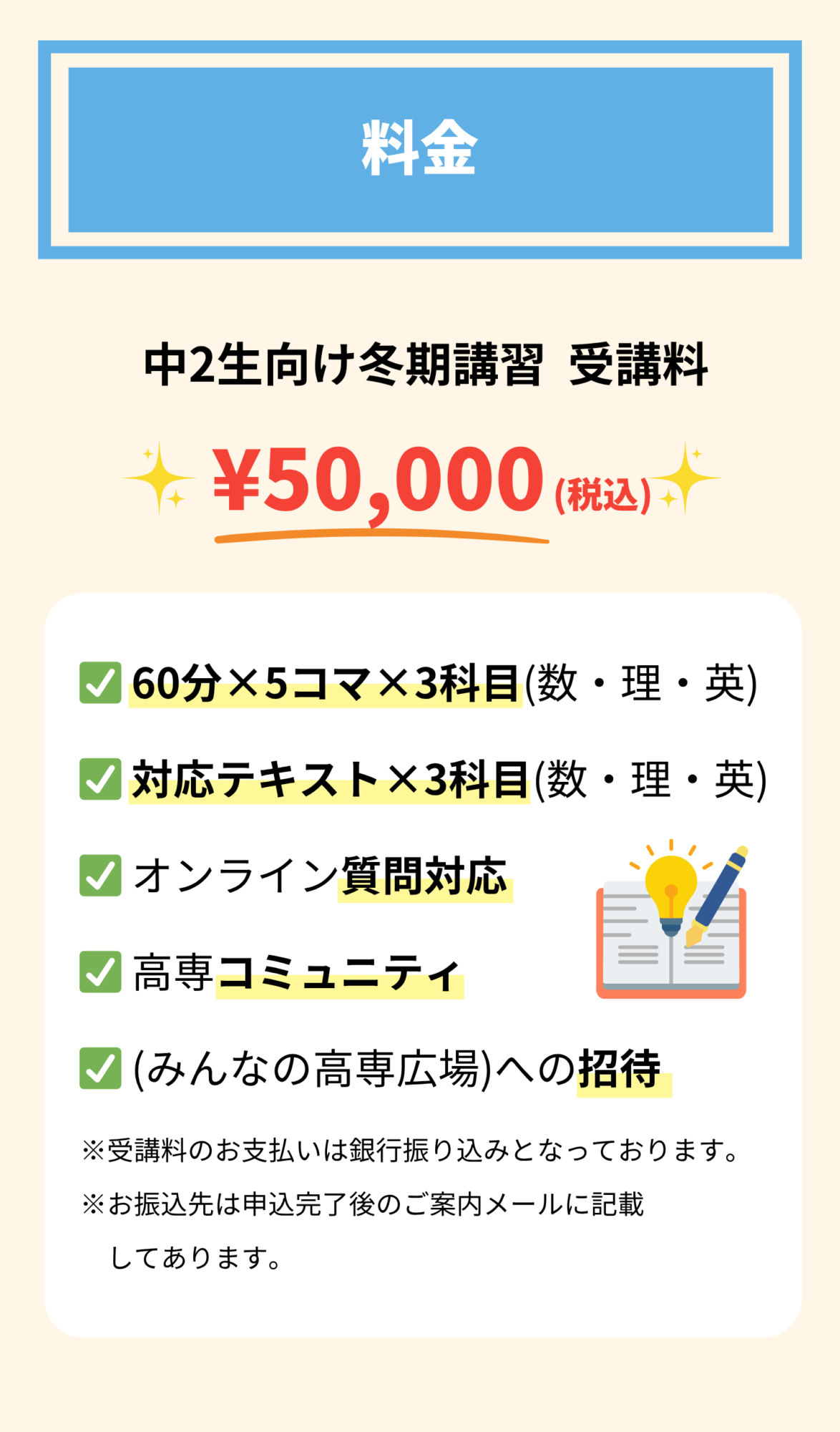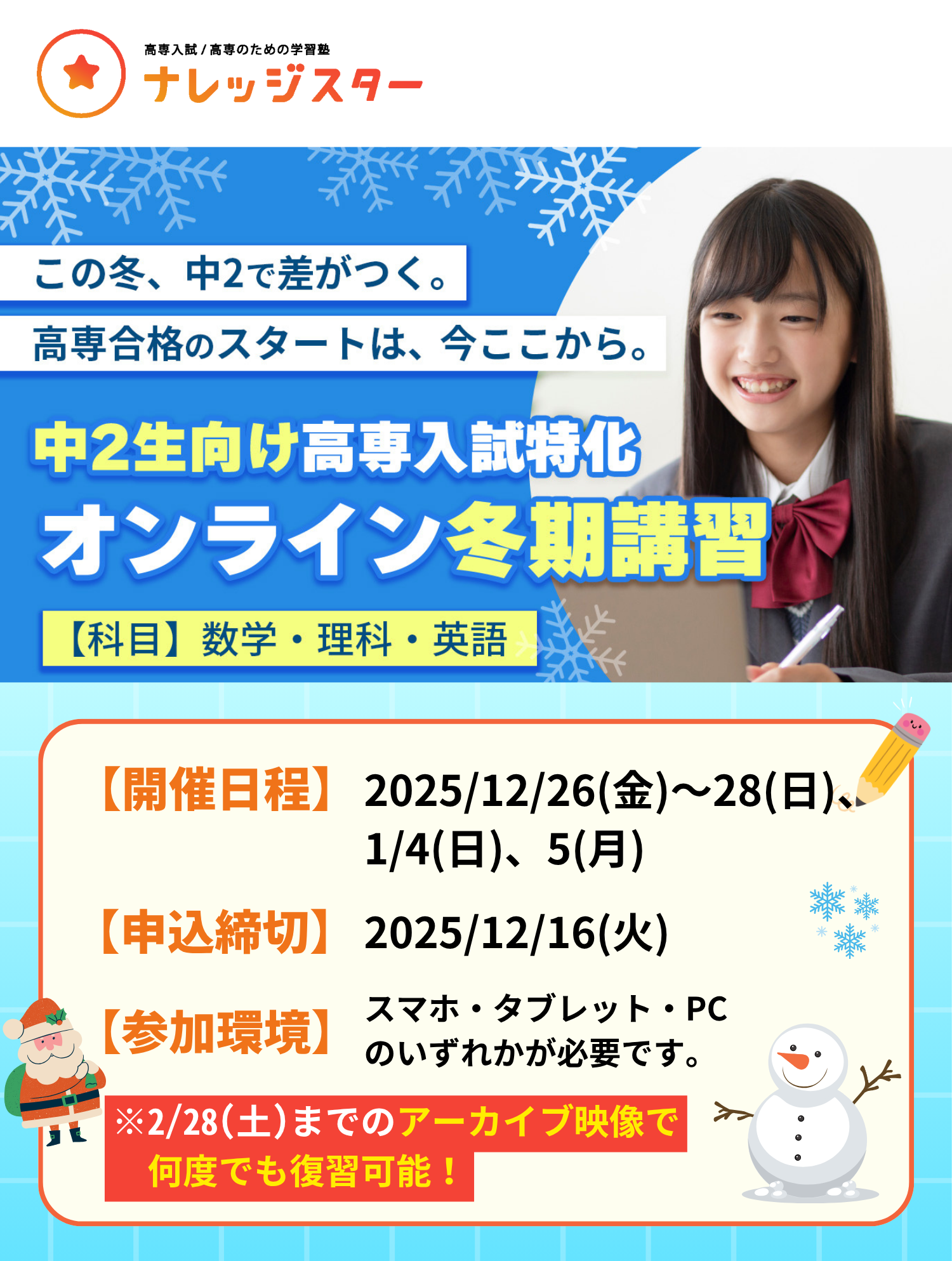 1分で申し込む!! 中3生向け冬期講習はこちら! 早期申込特典をチェック! \高専受験、差をつけるなら"今"/高専特化の冬期講習 1分で申し込む!! 11/9(日)まで早期申込特典も! 11/9(日)まで早期申込特典も! 高専受験で必須になる豪華6大特典プレゼント! 申し込んで特典を受け取る! ※早期申込特典は、11月10日(月)にメールにてお送りいたします。 \高専受験、差をつけるなら"今"/高専特化の冬期講習 1分で申し込む!! 11/9(日)まで早期申込特典も! \高専受験、差をつけるなら"今"/高専特化の冬期講習 1分で申し込む!! 11/9(日)まで早期申込特典も! 中2生向け冬期講習のお申し込み \ 全国どこからでも受講可能! / 1分で申し込む!