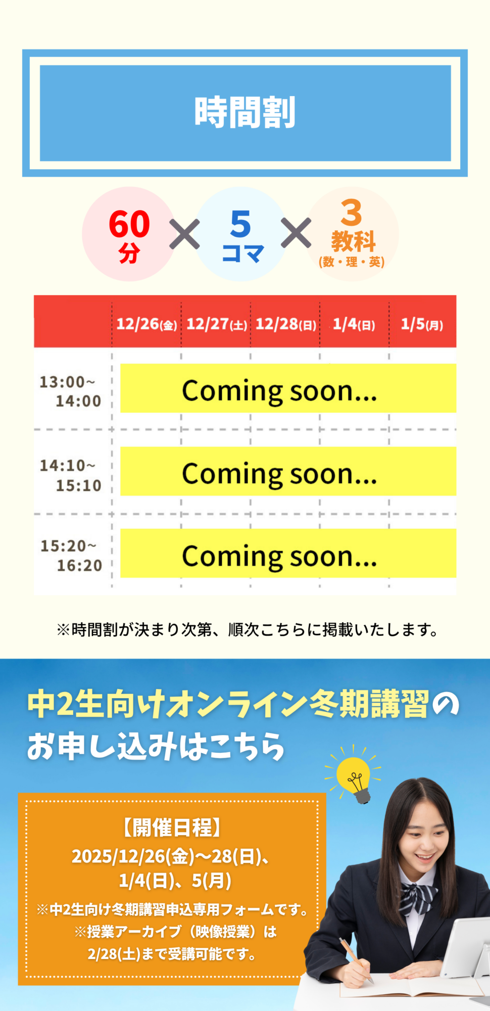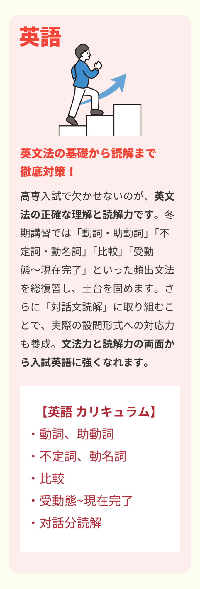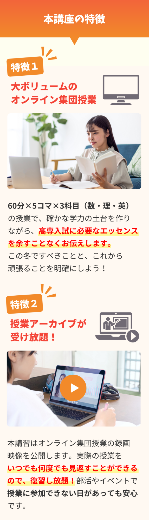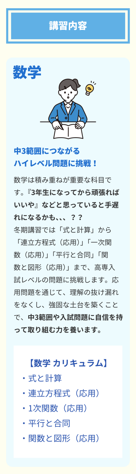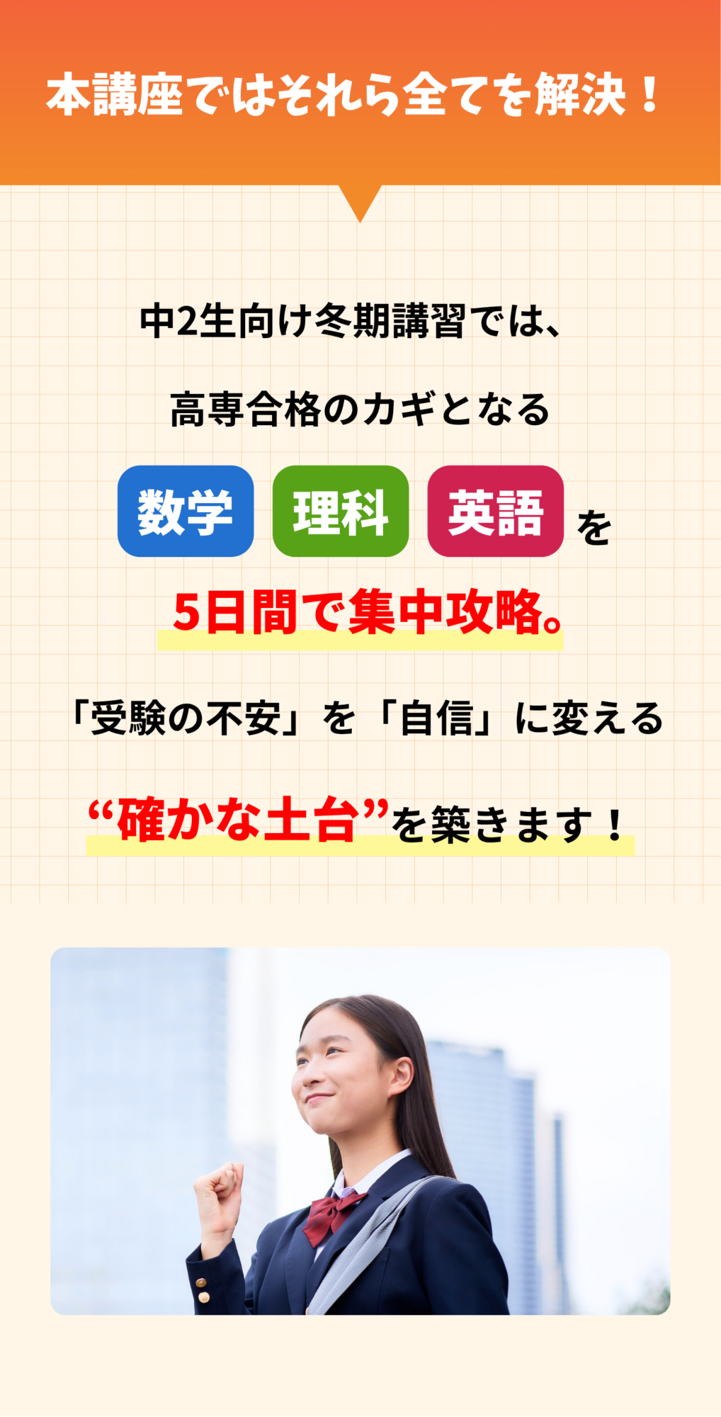 1分で申し込む!! 中3生向け冬期講習はこちら! 早期申込特典をチェック! \高専受験、差をつけるなら"今"/高専特化の冬期講習 1分で申し込む!! 11/9(日)まで早期申込特典も! 11/9(日)まで早期申込特典も! 高専受験で必須になる豪華6大特典プレゼント! 申し込んで特典を受け取る! ※早期申込特典は、11月10日(月)にメールにてお送りいたします。 \高専受験、差をつけるなら"今"/高専特化の冬期講習 1分で申し込む!! 11/9(日)まで早期申込特典も! \高専受験、差をつけるなら"今"/高専特化の冬期講習 1分で申し込む!! 11/9(日)まで早期申込特典も! 中2生向け冬期講習のお申し込み \ 全国どこからでも受講可能! / 1分で申し込む!