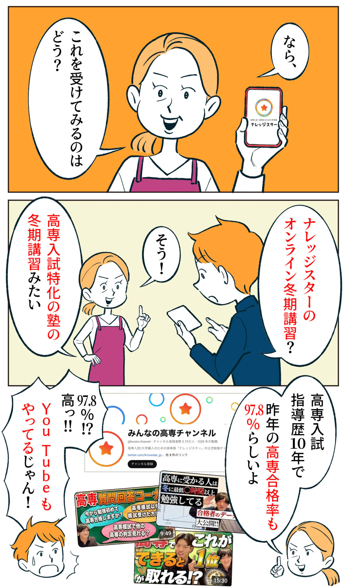 今後の5年間を決める特別な受験。高専特化で合格に近づきませんか? オンライン冬期講習 申込締切:2025/11/4(火) より詳しい情報はこちら! すでに150名以上がお申し込み! 今後の5年間を決める特別な受験。高専特化で合格に近づきませんか? オンライン冬期講習 申込締切:2025/11/4(火) より詳しい情報はこちら! 昨年度は700名以上の高専受験生が受講! 高専に合格したナレッジスター塾生の声▼ 高専入試まであと… 日 時間 分 秒 高専入試まで残りわずか。 一気に合格に近づくラストチャンス。 オンライン冬期講習 申込締切:2025/11/4(火) より詳しい情報はこちら! 本日お申し込みいただけると、最短11/6(木)からの受講が可能です。 高専入試まであと… 日 時間 分 秒 高専入試まで残りわずか。一気に合格に近づくラストチャンス。 オンライン冬期講習 申込締切:2025/11/4(火) より詳しい情報はこちら! ※本日お申し込みいただけると、最短で11/6(木)からの受講が可能です。 よくあるご質問 他の塾に通っていますが冬期講習を受講することは可能ですか? もちろん可能です。ナレッジスターは高専入試特化で対策をしていますので、高専に合格したい方はぜひご受講ください。 予定があり時間通りに受講できない場合どうしたら良いですか? 映像授業ですので後からでも受講することが可能です。ただし時間割通りに進めることでモチベーション維持にも繋がりますので、できる限り時間割通りに受講することを心がけてください。 振り込み期限はいつですか? 最終お振込期限は12/24(水)となります。ただし、お振込いただいた日によって受講開始が異なります。毎週水曜日がお振込み期限となり、翌日木曜日にご案内となります。また、プレミアムコースを受講する場合は、お申し込み日の次の木曜日から順次テキストを発送いたします。遅延時は時間割通りにご受講いただけない場合がございます。 どのコースを受ければいいかわかりません。 TOPページの無料勉強相談からフォームもしくはお電話でお気軽にお問い合わせください。 \申込締切:11/4(火)/ お申し込みはコチラから!