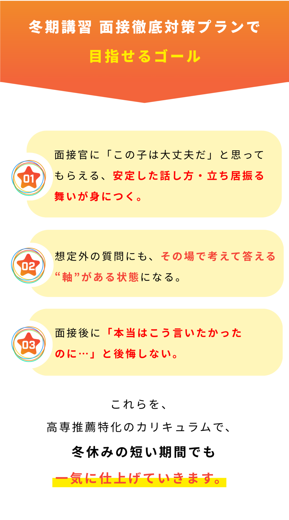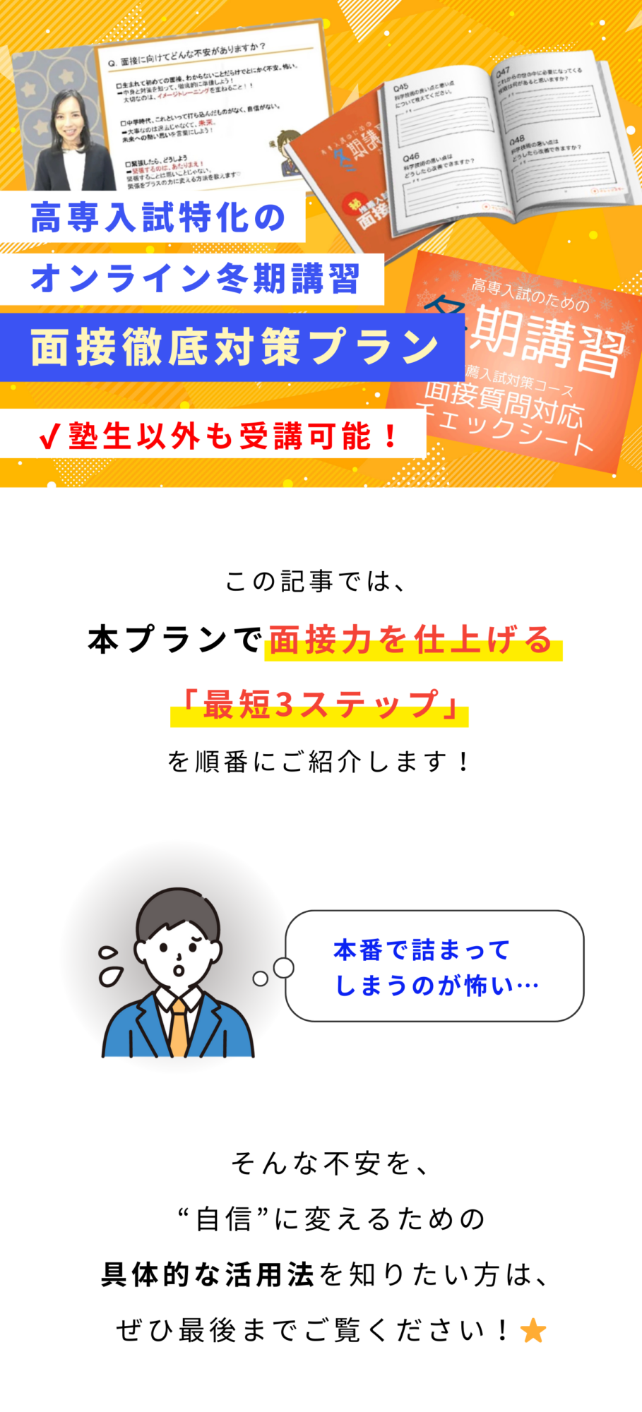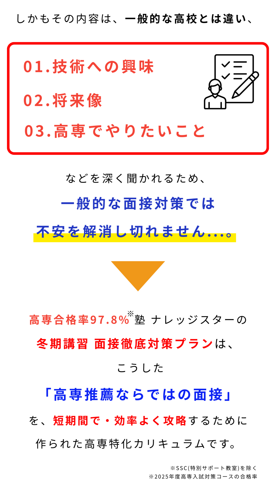 今後の5年間を決める特別な受験。高専特化で合格に近づきませんか? オンライン冬期講習 申込締切:2025/12/16(火) \初めての方・塾生以外も大歓迎!/ より詳しい情報はこちら! すでに650名以上がお申し込み! 今後の5年間を決める特別な受験。高専特化で合格に近づきませんか? オンライン冬期講習 申込締切:2025/12/16(火) \初めての方・塾生以外も大歓迎!/ より詳しい情報はこちら! すでに650名以上がお申し込み! 今後の5年間を決める特別な受験。高専特化で合格に近づきませんか? オンライン冬期講習 申込締切:2025/12/16(火) \初めての方・塾生以外も大歓迎!/ より詳しい情報はこちら! すでに650名以上がお申し込み! 今後の5年間を決める特別な受験。高専特化で合格に近づきませんか? オンライン冬期講習 申込締切:2025/12/16(火) \初めての方・塾生以外も大歓迎!/ より詳しい情報はこちら! すでに650名以上がお申し込み! \お電話はコチラから!/ 【対応日時】火曜~金曜 13:00~21:00 土曜・日曜 10:00~19:00 【定休】月曜 メール相談フォームはこちら! ※忙しかったらすぐに切ってもOK※コース説明が目的でしつこい勧誘はありません。 高専に合格したナレッジスター塾生の声▼ よくあるご質問 他の塾に通っていますが冬期講習を受講することは可能ですか? もちろん可能です。ナレッジスターは高専入試特化で対策をしていますので、高専に合格したい方はぜひご受講ください。 予定があり時間通りに受講できない場合どうしたら良いですか? 映像授業ですので後からでも受講することが可能です。ただし時間割通りに進めることでモチベーション維持にも繋がりますので、できる限り時間割通りに受講することを心がけてください。 振り込み期限はいつですか? 最終お振込期限は12/24(水)となります。ただし、お振込いただいた日によって受講開始が異なります。毎週水曜日がお振込み期限となり、翌日木曜日にご案内となります。また、プレミアムコースを受講する場合は、お申し込み日の次の木曜日から順次テキストを発送いたします。遅延時は時間割通りにご受講いただけない場合がございます。 どのコースを受ければいいかわかりません。 TOPページの無料勉強相談からフォームもしくはお電話でお気軽にお問い合わせください。 最短ルートで高専合格に近づく。 オンライン冬期講習 申込締切:2025/12/16(火) \初めての方・塾生以外も大歓迎!/ より詳しい情報はこちら! すでに650名以上がお申し込み! 最短ルートで高専合格に近づく。 オンライン冬期講習 最終締切:2025/12/16(火) \初めての方・塾生以外も大歓迎!/ より詳しい情報はこちら! すでに650名以上がお申し込み! \12/16(火)締切!/ お申し込みはコチラから!