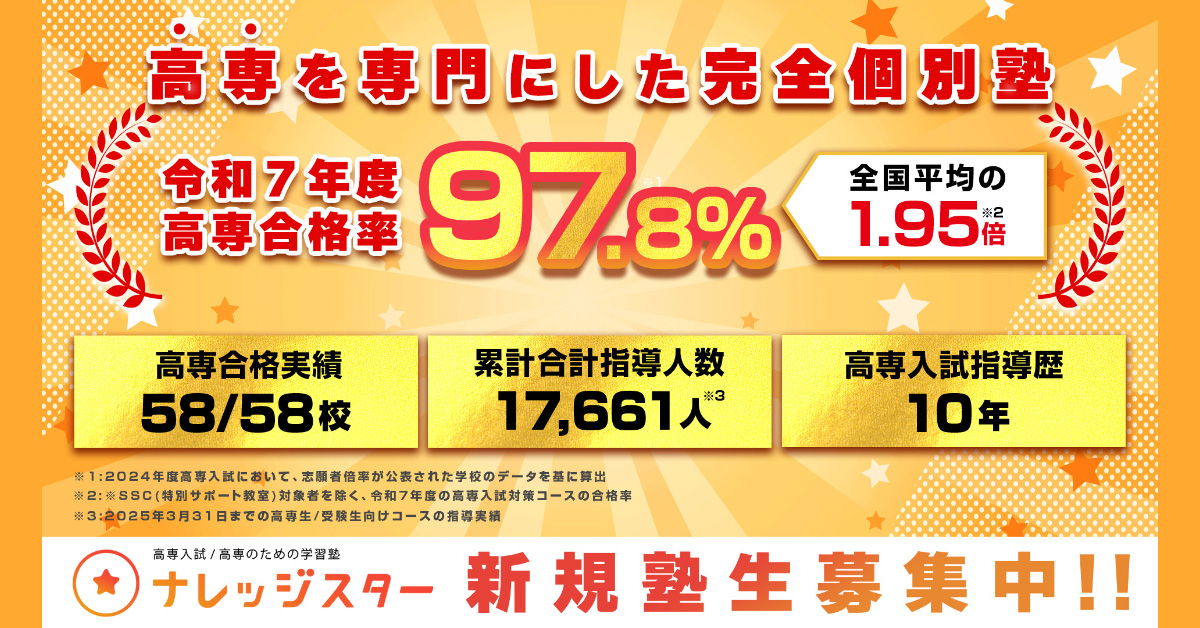 日程:3月22日(日) 19:00-20:30締切:3月22日(日) 17:00まで 1分で申し込む 開催日:2/21(金) 20:00-21:30 締切日:2/21(金) 12:00 1分で申し込む \高専専門塾ナレッジスターが無料開催!/ \高専専門塾ナレッジスターが無料開催!/ 中2生向け高専受験説明会 高専受験説明会 高専入試指導歴10年の経験から高専の特徴や進路・入試形式・今からやるべき高専入試対策方法 など高専受験をスタートするために必要な情報をまるっと徹底解説! 高専入試指導歴10年の経験から高専の特徴や進路・入試形式・今からやるべき高専入試対策方法 など高専受験をスタートするために必要な情報をまるっと徹底解説! ナレッジスターの指導実績 高専入試指導歴10年 高専合格実績58/58高専 累計指導人数17,661人※ ※:2025年3月31日まで高専受験生向け全コースの指導実績 受験説明会 参加者の満足度 参加者様の声 ・どのようなペースで勉強するのが良いのかが参考になった! ・高専入試の難しさが具体的にわかった! ・調べきれない情報が聞けたので良かった! ・絶対合格したいという気持ちになりました!・高専の良さが改めてわかった! ※2026年2月6日開催「第一回高専受験説明会」参加者を対象に実施したアンケート結果(有効回答11名)。「とても良かった」「良かった」の合計。 解説するのは高専入試対策のプロ! 解説するのは高専入試対策のプロ! 渡邊 友章 「みんなの高専チャンネル」のメインMC仙台高専 マテリアル環境工学科卒業 渡部 滉也 高専入試指導歴6年高専塾運営責任者東北大学理学部数学科卒業 かとゆー先生 高専特化アドバイザー 1,000人以上の高専受験生を個別サポート はるた先生 高専特化アドバイザー 1,000人以上の高専受験生を個別サポート 渡邊 友章 「みんなの高専チャンネル」のメインMC 仙台高専 マテリアル環境工学科卒業 チャンネル登録者4.5万人 高専情報番組「みんなの高専チャンネル」のメインMCを務める、自称「日本一高専に詳しい高専系YouTuber」が、高専入試本番の注意事項や事前準備を徹底解説! 渡部 滉也 高専入試指導歴6年高専塾運営責任者東北大学理学部数学科卒業 チャンネル登録者4.5万人 高専情報番組「みんなの高専チャンネル」のメインMCを務める、自称「日本一高専に詳しい高専系YouTuber」が、高専入試本番の注意事項や事前準備を徹底解説! かとゆー先生 高専進路アドバイザー 1,000人以上の高専受験生を個別サポート チャンネル登録者4.5万人 高専情報番組「みんなの高専チャンネル」のメインMCを務める、自称「日本一高専に詳しい高専系YouTuber」が、高専入試本番の注意事項や事前準備を徹底解説! はるた先生 高専進路アドバイザー 1,000人以上の高専受験生を個別サポート チャンネル登録者4.5万人 高専情報番組「みんなの高専チャンネル」のメインMCを務める、自称「日本一高専に詳しい高専系YouTuber」が、高専入試本番の注意事項や事前準備を徹底解説! 代表|メインMC あっきー 自称「日本一高専に詳しい高専系YouTuber」が、高専入試の仕組みや全容を解説! 塾運営責任者|数学 こーや先生 数学の教員免許も取得する「数学のプロ」が高専入試における数学の入試傾向や対策方法を徹底解説! 代表講師|理科 原口先生 「高専入試指導歴8年」の高専入試のプロが理科の入試傾向や対策方法を徹底解説! 代表講師|英語 もえ先生 英語ペラペラの「バイリンガル講師」が高専入試における英語の入試傾向や対策方法を徹底解説! こんな人におすすめ 進路はまだ迷っているが 受験勉強は開始したい人 高専を目指していて勉強モチベを上げたい人 受験への危機感がないお子さんを持つ親御さん 高専を受験する可能性のある全ての中学生と保護者様が対象の無料オンライン相談会です! 過去開催された高専受験説明会の雰囲気を一部チラ見せ! さらに…! 3/15(日)まで限定特典も! 高専入試で必須になる5大特典プレゼント! ※特典は3月16日にメールにてお送りします。 1分で特典を受け取る! こんな人におすすめ 高専入試までの対策方法や 受験時の注意点を知りたい人 高専を目指しているが何からすればいいか分からない人 お子さんの高専受験に 不安を抱えている保護者様 高専受験を考えている全ての中学生と保護者様が対象の無料オンライン説明会です!※中2生以下の参加も歓迎です 概要 日時 2026年3月22日(日) 19:00-20:30 申込締切 2026年3月22日(日) 17:00まで 参加費用 無料 内容 高専の特徴と進路高専の入試形式今やるべき高専入試対策方法高専入試に向けた勉強スケジュール質問回答(Q&A) 高専入試本番で絶対注意してほしい2つのこと親御さんができる入試前のサポート3選入試直前の対策方法について質問回答(Q&A) 開催場所 オンライン ※インターネットに繋がれば全国どこからでも参加可能です。 参加方法 まずはお申し込み情報をフォームにご記入ください。当日の18時までに、説明会参加URLが記載されたメールが届きます。本説明会は、YouTubeライブ(限定公開)にて開催いたします。※スマホ、PC、タブレット、インターネットに接続できれば参加可能で