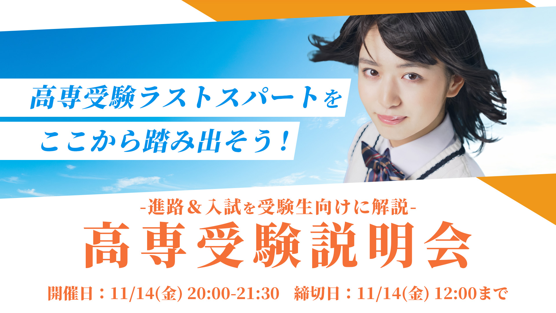 日程:11月14日(金) 20:00-21:30締切:11月14日(金) 12:00まで 1分で申し込む 開催日:2/21(金) 20:00-21:30 締切日:2/21(金) 12:00 1分で申し込む \高専専門塾ナレッジスターが無料開催!/ \高専専門塾ナレッジスターが無料開催!/ 高専受験説明会 高専受験説明会 高専入試指導歴10年の経験から高専の特徴や進路・入試形式・今からやるべき高専入試対策方法 など高専受験をスタートするために必要な情報をまるっと徹底解説! 高専入試指導歴10年の経験から高専の特徴や進路・入試形式・今からやるべき高専入試対策方法 など高専受験をスタートするために必要な情報をまるっと徹底解説! ナレッジスターの指導実績 高専入試指導歴10年 高専合格実績58/58高専 累計指導人数17,661人※ ※:2025年3月31日まで高専受験生向け全コースの指導実績 解説するのは高専入試対策のプロ! 解説するのは高専入試対策のプロ! 渡邊 友章 「みんなの高専チャンネル」のメインMC仙台高専 マテリアル環境工学科卒業 渡部 滉也 高専入試指導歴6年高専塾運営責任者東北大学理学部数学科卒業 渡邊 友章 「みんなの高専チャンネル」のメインMC 仙台高専 マテリアル環境工学科卒業 チャンネル登録者4.5万人 高専情報番組「みんなの高専チャンネル」のメインMCを務める、自称「日本一高専に詳しい高専系YouTuber」が、高専入試本番の注意事項や事前準備を徹底解説! 渡部 滉也 高専入試指導歴6年高専塾運営責任者東北大学理学部数学科卒業 チャンネル登録者4.5万人 高専情報番組「みんなの高専チャンネル」のメインMCを務める、自称「日本一高専に詳しい高専系YouTuber」が、高専入試本番の注意事項や事前準備を徹底解説! 代表|メインMC あっきー 自称「日本一高専に詳しい高専系YouTuber」が、高専入試の仕組みや全容を解説! 塾運営責任者|数学 こーや先生 数学の教員免許も取得する「数学のプロ」が高専入試における数学の入試傾向や対策方法を徹底解説! 代表講師|理科 原口先生 「高専入試指導歴8年」の高専入試のプロが理科の入試傾向や対策方法を徹底解説! 代表講師|英語 もえ先生 英語ペラペラの「バイリンガル講師」が高専入試における英語の入試傾向や対策方法を徹底解説! こんな人におすすめ 進路はまだ迷っているが 受験勉強は開始したい人 高専を目指していて勉強モチベを上げたい人 受験への危機感がないお子さんを持つ親御さん 高専を受験する可能性のある全ての中学生と保護者様が対象の無料オンライン相談会です! 過去開催された高専受験説明会の雰囲気を一部チラ見せ! さらに…! 10/5(日)まで限定特典も! 高専入試で必須になる5大特典プレゼント! 1分で特典を受け取る! こんな人におすすめ 高専入試までの対策方法や 受験時の注意点を知りたい人 高専を目指しているが何からすればいいか分からない人 お子さんの高専受験に 不安を抱えている保護者様 高専受験を考えている全ての中学生と保護者様が対象の無料オンライン説明会です!※新中2生以下の参加も歓迎です 概要 日時 2025年11月14日(金) 20:00-21:30 申込締切 2025年11月14日(金) 12:00まで 参加費用 無料 内容 高専の特徴と進路高専の入試形式今やるべき高専入試対策方法高専入試に向けた勉強スケジュール質問回答(Q&A) 高専入試本番で絶対注意してほしい2つのこと親御さんができる入試前のサポート3選入試直前の対策方法について質問回答(Q&A) 開催場所 オンライン ※インターネットに繋がれば全国どこからでも参加可能です。 参加方法 まずはお申し込み情報をフォームにご記入ください。当日の18時までに、説明会参加URLが記載されたメールが届きます。本説明会は、YouTubeライブ(限定公開)にて開催いたします。※スマホ、PC、タブレット、インターネットに接続できれば参加可能です。 参加で知れる3つのポイント 01 高専入試の 仕組みと全体像 02 高専入試の 傾向と攻略法 03 受験勉強方法と スケジュール 参加の流れ STEP 1 1分でお申込み お申し込みいただいてから2営業日以内に受付完了メールをお送りします。※自動返信メールです。 STEP 2 参加準備 11/14(金)の18:00までにメールにて参加者専用ページのURLが届きます。スマホやタブレットなどをご準備ください。 STEP 3 説明会開始 説明会は20:00開始です。時間になったらSTEP2のメールに記載されいているURLにアクセスしてください。 申込フォーム